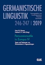 Hans W. Giessen & H. Lenk (Hrsg.): Persuasionsstile in Europa IV: Typen und Textmuster von Kommentaren in Tageszeitungen (Germanistische Linguistik 246-247 [2019]). Hildesheim / Zürich / New York: Georg Olms 2020. 356 S. ISBN 978-3-487-15845-7 Inhaltsverzeichnis |