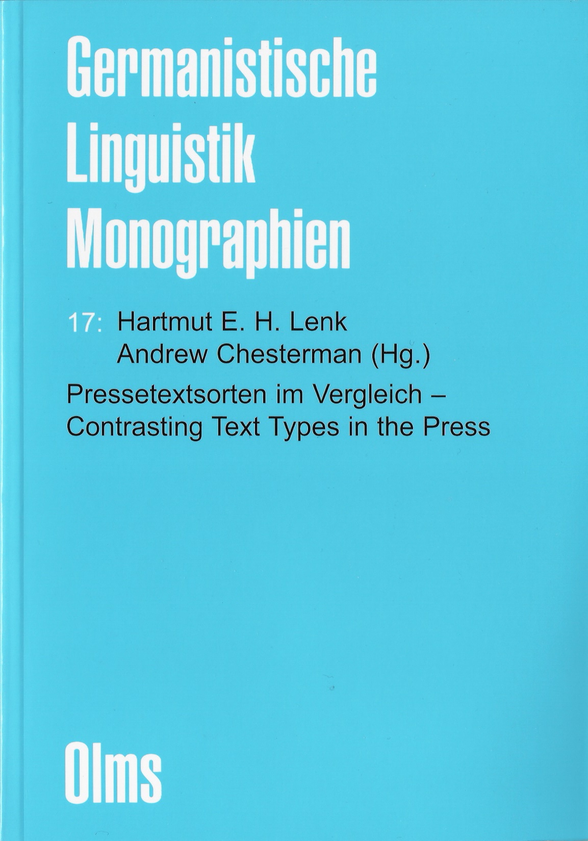 Hans W. Giessen & H. Lenk (Hrsg.): Persuasionsstile in Europa IV: Typen und Textmuster von Kommentaren in Tageszeitungen. (Germanistische Linguistik 246-247). Hildesheim / Zürich / New York: Georg Olms. 356 S. ISBN 978-3-487-15845-7 Inhaltsverzeichnis |
