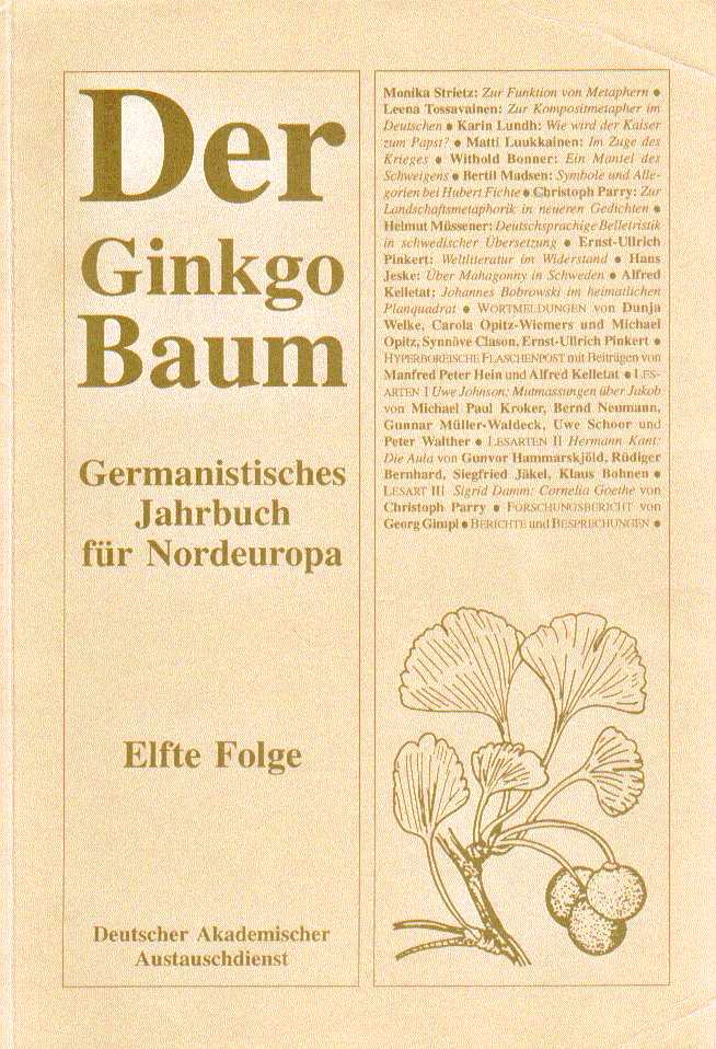 47.) Redaktion: Korhonen, Jarmo; Moilanen, Markku (Hg.): Der Ginkgo-Baum. Germanistisches Jahrbuch für Nordeuropa, Estland, Lettland und Litauen. 12. Folge. Helsinki: Finn Lectura. 372 S. ISSN 0359-7210.